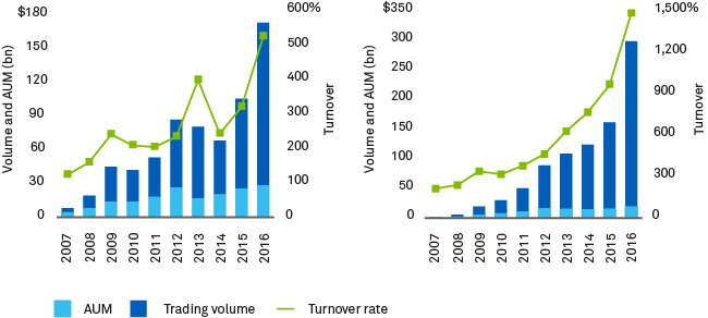 1 Source: BlackRock, Bloomberg, as of 31 December 2016. Trading volume represents the cumulative annual trading volume of the ETF. Turnover rate represents annual trading volume as a percent of AUM. There can be no assurance that an active trading market for iShares of an ETF will develop or be maintained.