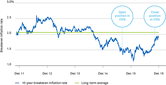 A investor took a tactical view on inflation by opening a position in the iShares $ TIPS UCITS ETF (ITIPS) when the market’s inflation expectations appeared to be low. The manager then closed the ETF position when inflation reverted back to its
