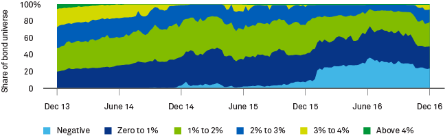 1. Source: BlackRock Investment Institute, J.P. Morgan, Thomson Reuters, as of 31 December 2016. The chart is based on the J.P. Morgan Global Developed Bond Index. Areas show the proportion of bonds in the index with yields in each range.