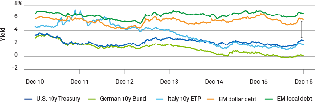 2. Source: BlackRock Investment Institute, J.P. Morgan, Thomson Reuters, as of 31 December 2016. Emerging market (EM) local debt based on JP Morgan GBI Global Diversified Index, EM dollar debt based on JP Morgan EMBI Global Diversified Index. 10-yer sovereign yields based on Datastream benchmark indexes. Past performance does not guarantee future results.