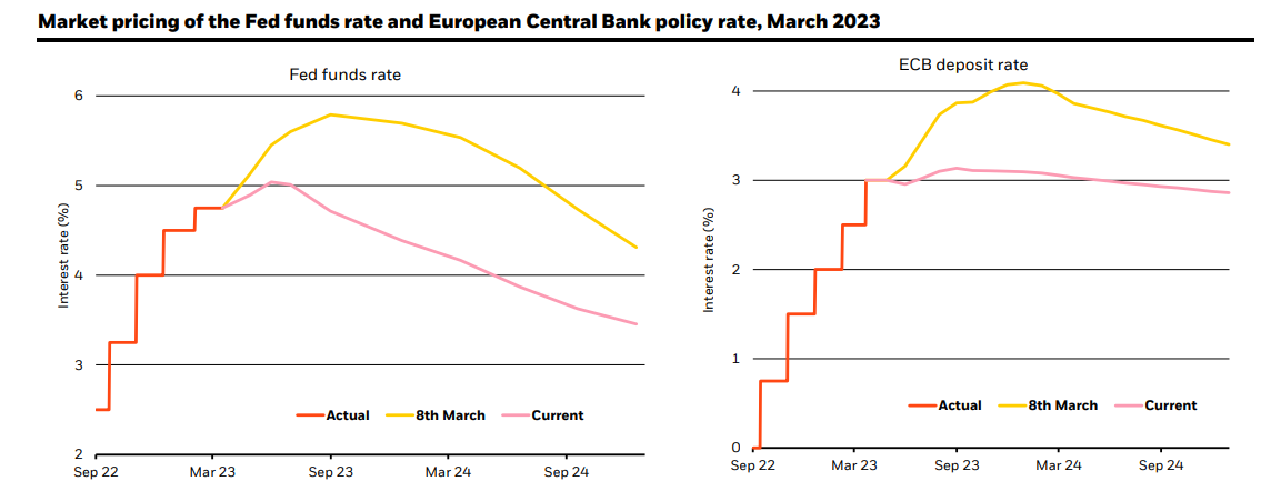 Source: Forward looking estimates may not come to pass. Source: BlackRock Investment Institute, with data from Refinitiv Datastream, March 2023. Notes: The charts show the forward fed funds rate and the European Central Bank deposit rate through December 2024 as implied by futures prices