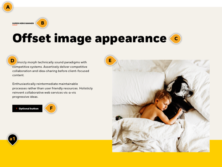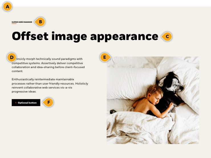 The Super hero banner is our largest and most impactful banner. It should be used for specific high-traffic campaign landing pages, and should help set up diverse and related content for visitors to explore. We recommend using this banner sparingly and getting pre-approval from the design team prior to rolling your page out.