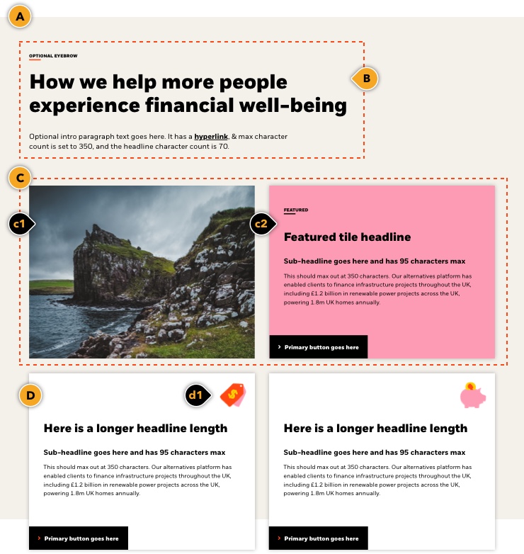 The Hub tile component was created for users see different topics related to a category and get a little bit of information before deciding which direction they want to explore on that topic. Use this for all Hub landing pages to ensure consistency across our ecosystem.