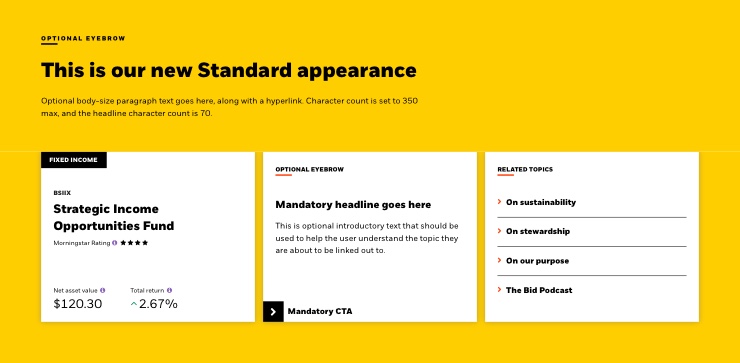 With our new offset appearances, the tiles sit below the color background, allowing for a more connected visual flow to a related topic/component below. It is important to use this correctly, and to implement the correct “bottom fill” section to ensure this visually aligns to the component stacked below.