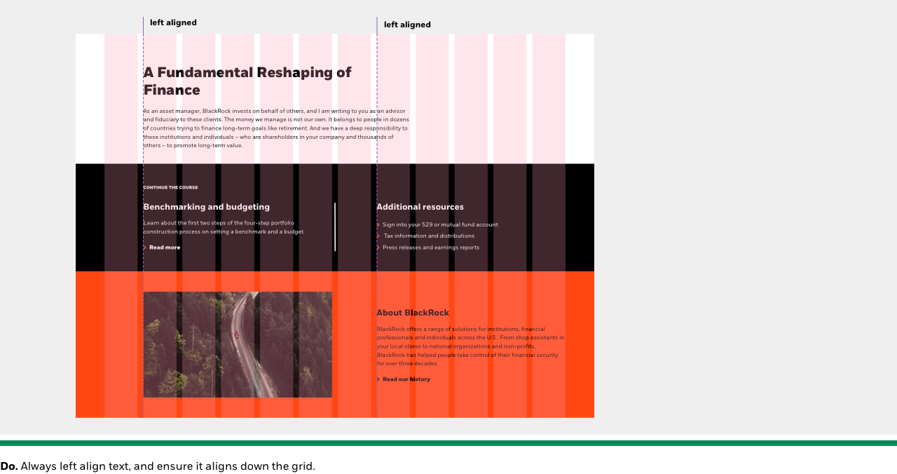 For all experiences across BlackRock brands, all headline, subhead, and body copy is left aligned. This improves legibility, and maintains a consistent experience across channels.