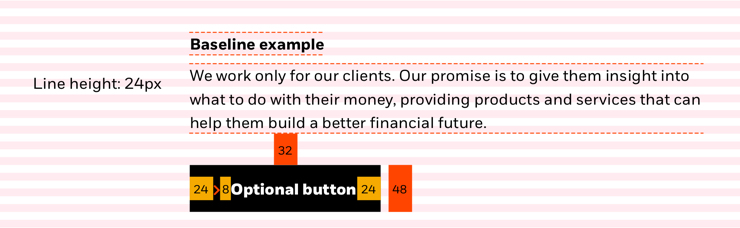 Baseline grids are invisible, vertical lines that are used to create consistent vertical spacing between standard elements, such as an app bar, list item, or typographic layouts. At BlackRock, we align to an 8px grid. We also use multiples of 8 when defining measurements, spacing, and positioning elements.