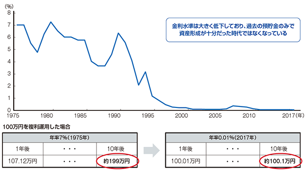 かつては預貯金のみで十分であったかもしれませんが、金利環境が変化し、預貯金のみではなかなか資産形成ができない状況になっています。1975年頃には預貯金の金利は高水準にあり、たとえば郵便局の定額貯金に10年間お金を預けておけば、複利の効果もあり100万円の元本が約199万円になりました。つまり、預貯金に置いておくだけで資産をほぼ2倍にできたのです。ところが現在のような超低金利のもとでは、預貯金に置いておいてもお金はほとんど増えません。金利が年0.01%とすると、100万円を預けても10年後に約100万1,000円にしかならないのです。