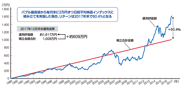資産形成の観点では「時間」が強みになります。例えば日経平均株価のインデックスにバブルの最高値のときからつみたて投資をしていたと仮定すると、2017年末時点のリターンは投資元本を60.4%も上回る計算になります。