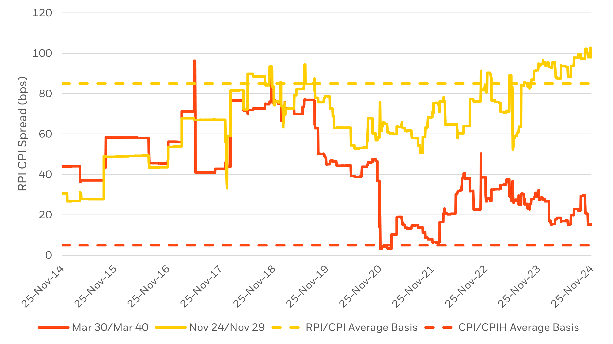 CPI curves are available daily from pricing vendors, so one can compare CPI and RPI pricing. However, the 2030 start date of RPI reform confuses matters, with pricing up to that point reflecting the RPI/CPI wedge and pricing beyond this point reflecting a blend of RPI/CPI and CPI/CPIH.